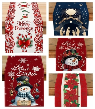 Fábrica al por mayor 72 pulgadas muñeco de nieve Poinsettia bastón de caramelo Navidad camino de mesa para vacaciones invierno decoración del hogar de temporada
